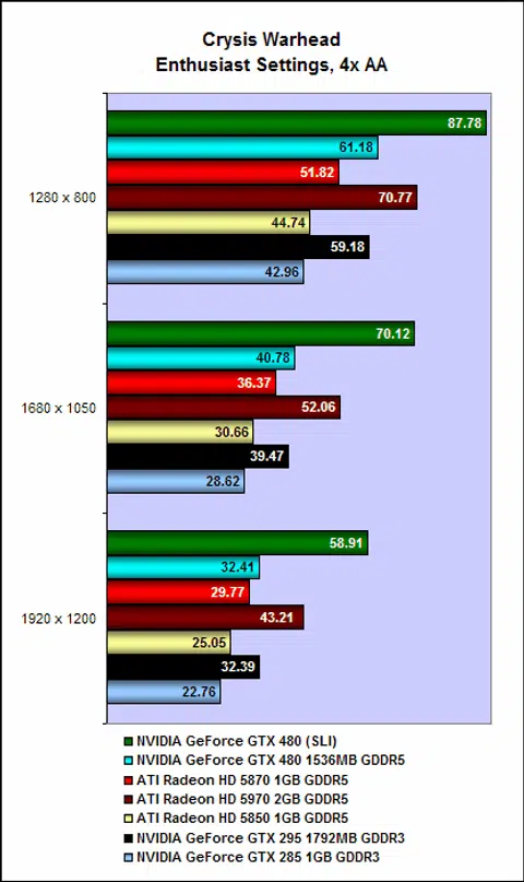 NVIDIA's claim of improved SLI performance seems to be spot on, as we experienced substantial boost to performance, especially on the more demanding settings. Take Crysis Warhead for example, at 1920 x 1200 with 4x anti-aliasing enabled, a single GeForce GTX 480 managed 32.41fps; add another GeForce GTX 480, however, and performance takes a massive hike to 58.91fps, an over 80% increase in performance.