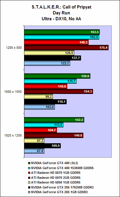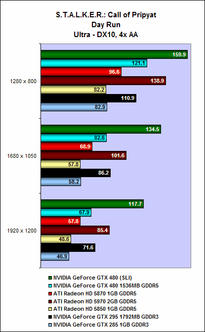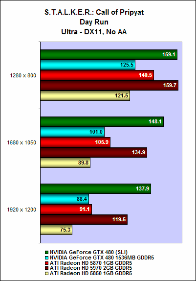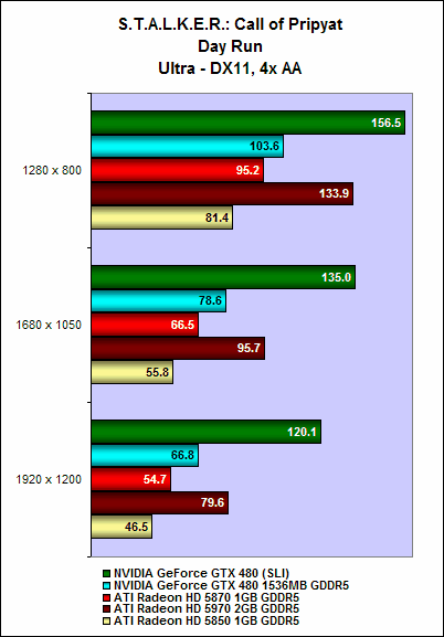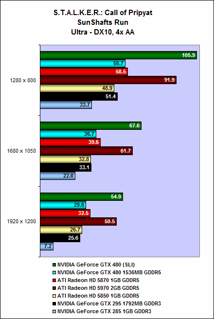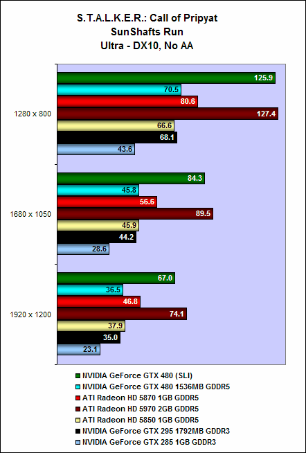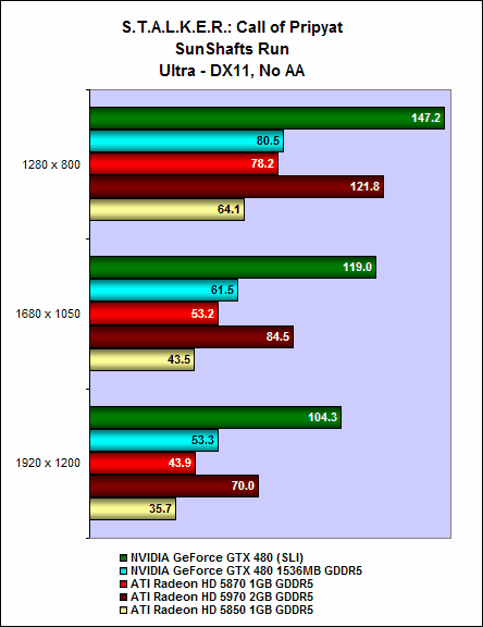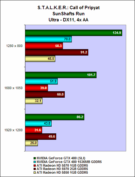 It is the same story with S.T.A.L.K.E.R.: Call of Pripyat. On the SunShafts Run, with DirectX 11, tessellation and 4x anti-aliasing enabled, a single GeForce GTX 480 could do only 43.8fps; but two GeForce GTX 480 cards in SLI could achieve a whopping 86.2fps, a whopping 96% increase in performance.