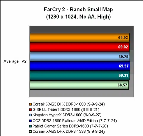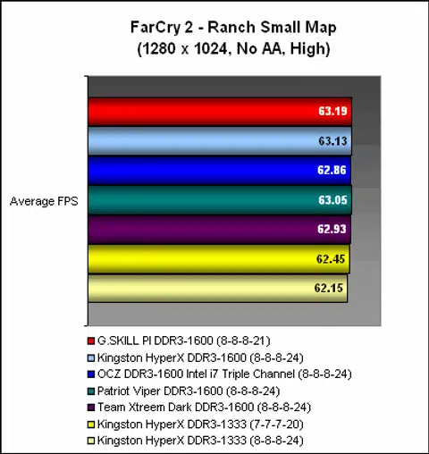 All the memory modules were effectively tied in Far Cry 2 as our average FPS returned almost identical results, with perhaps the DDR3-1333 memory lagging by a microscopic difference.