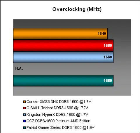 Our results for the dual-channel kits found that as a bunch, they fared worse in terms of the frequency overclock when compared to the triple-channel kits. This could be due to the motherboard used, different platforms and even the fact that these dual-channel kits are made up of 2GB modules instead of 1GB each. However the motherboard used was the top in our roundup of its class and memory from Patriot is especially made for the AMD platform. Yet all the tested modules performed quite similarly for overclocking.