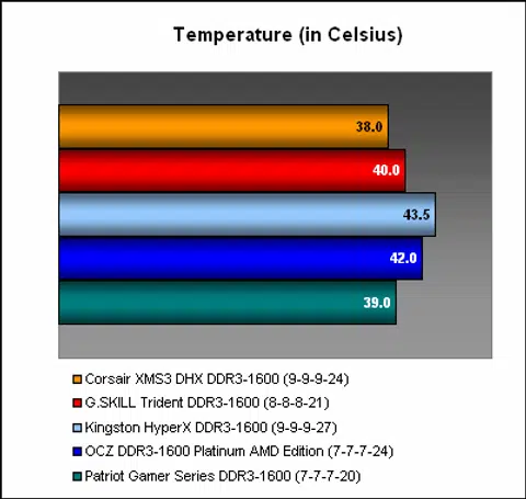 Despite having the same heat spreader design as its dual-channel counterpart, the Kingston triple-channel kit came in with the lowest temperatures here. Perhaps the lower voltage here compared to the 1.7 to 1.9V range for the dual-channel version contributed to its better performance. This could imply that Kingston's heat spreaders may in fact be very decent. The other memory modules, with the exception of OCZ, had very similar temperature readings of around 42 degrees Celsius.