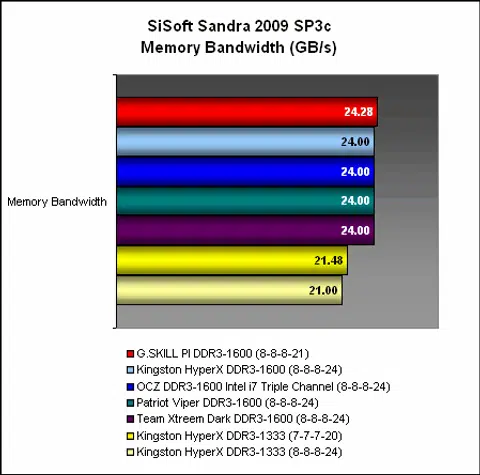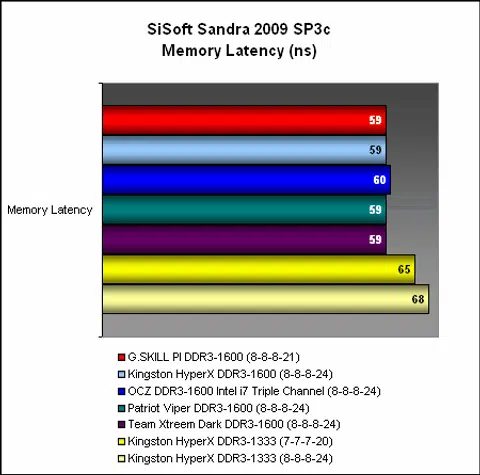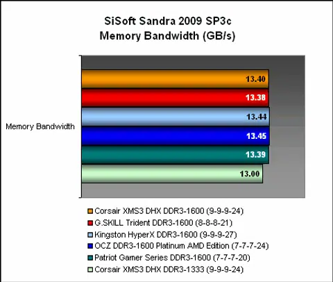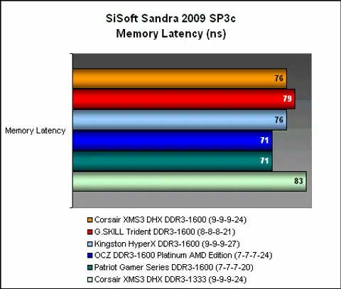 Next, we used SiSoft Sandra 2009's built-in benchmark tools to give an estimate on the bandwidth and latency numbers for the memory modules. Since they perform mostly up to their specifications, the differences here were very minor and reflected their general capabilities.