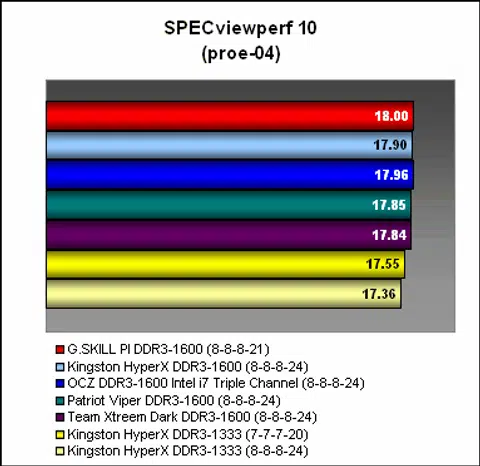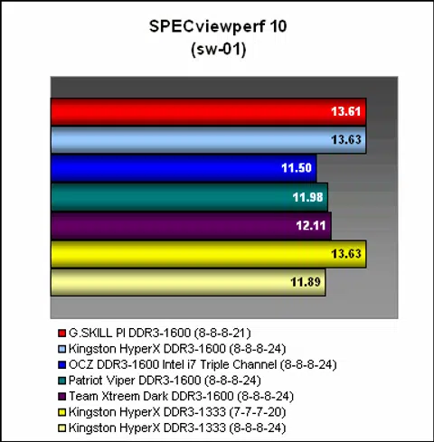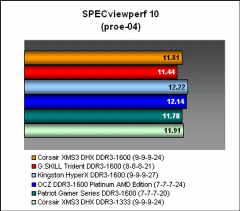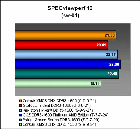 While the test sets from SPECviewperf 10 highlighted here stressed more on the memory subsection, the numbers for PRO/ENGINEER did not vary too much as the difference between the top and the bottom rung here was merely 6% and even the DDR3-1333 memory was competitive. This grew more pronounced for the second test set, where the DDR3-1333 memory fell behind, with the G.SKILL Trident also surprisingly the slowest of the DDR3-1600 bunch.