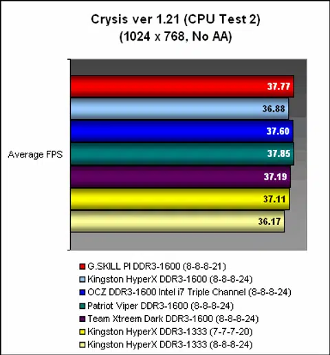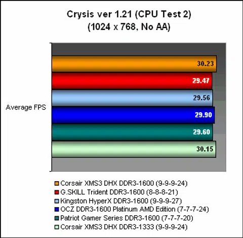 Our first game benchmark, Crysis, did not appear to be too picky with the brand of memory used as the variance in scores was extremely small and negligible to the user. Surprisingly, Corsair memory seemed to have the 'edge' here, with even the DDR3-1333 version right at the top, followed by OCZ.