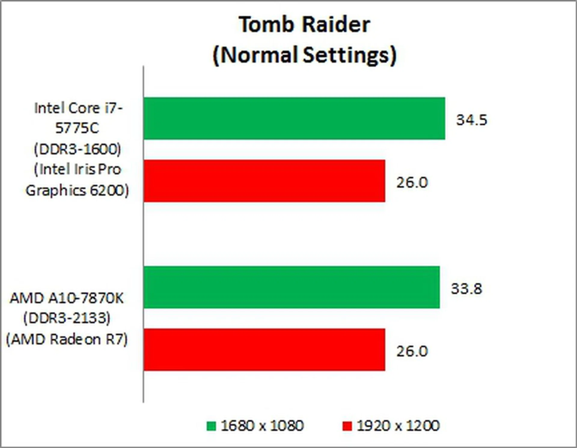 We put the game settings to the generic Normal mode, and tested the processors at two resolutions. The Intel Core i7-5775C pulled ahead slightly, but at the higher resolution of 1,920 x 1,200 pixels, their scores flatlined at 26fps.