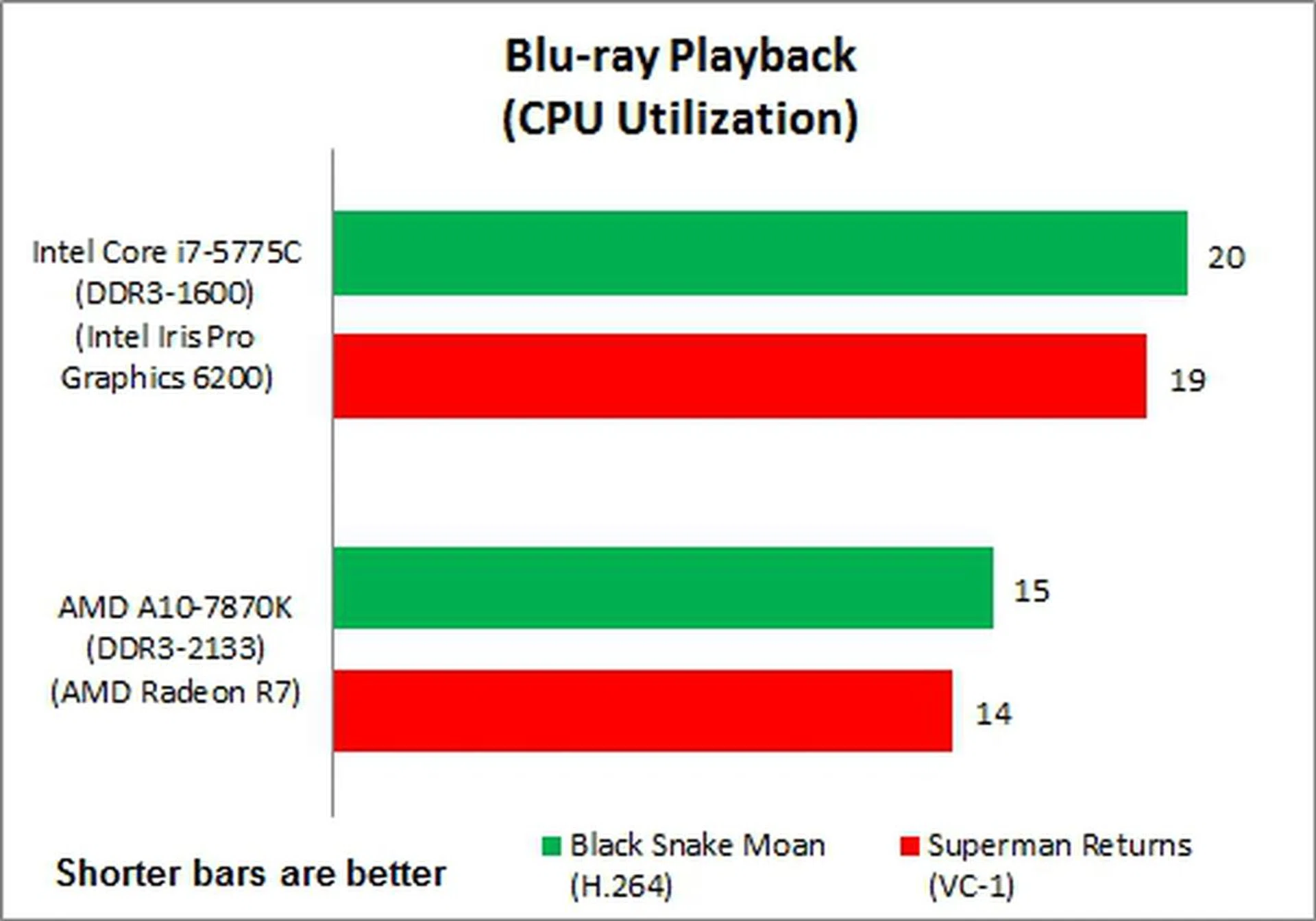 For our video decoding performance tests, the results swung back in favor, albeit only slightly, for the A10-7870K APU. In the past, we were used to CPU workloads of about 4- to 10%, and this was seen on our older Windows 7 testing platforms. However, with our new Windows 10 Home operating system, the CPU utilization loads are now in the range of 14- to 20%.