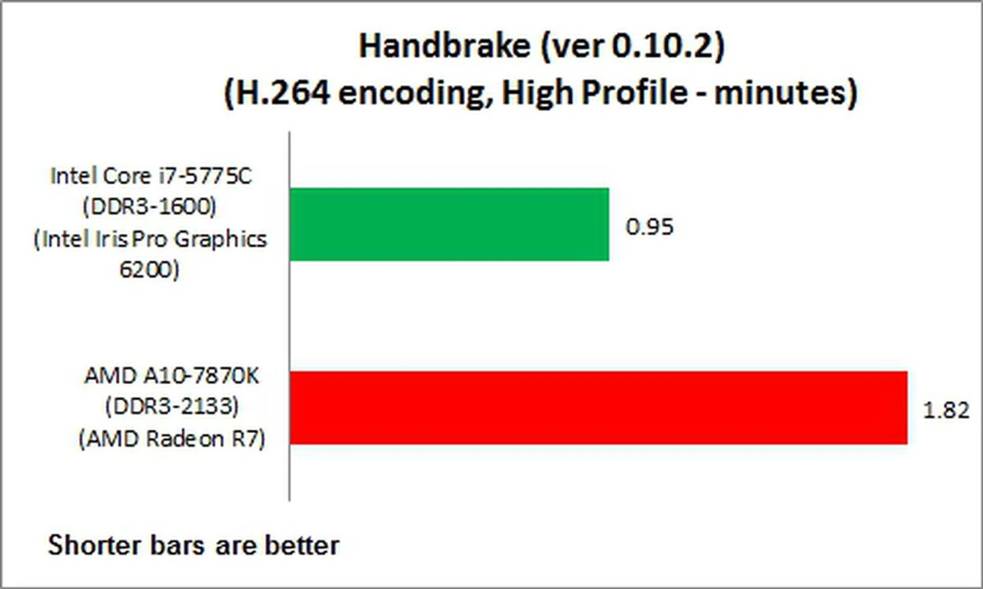 For the video encoding test, we upgraded the Handbrake software to version 0.10.2. The CPU prowess of the Core i7-5775C is evident despite the fact that Handbrake is supposed to support AMD's transcoding engine. The Intel processor was almost twice as fast the AMD APU for this test.