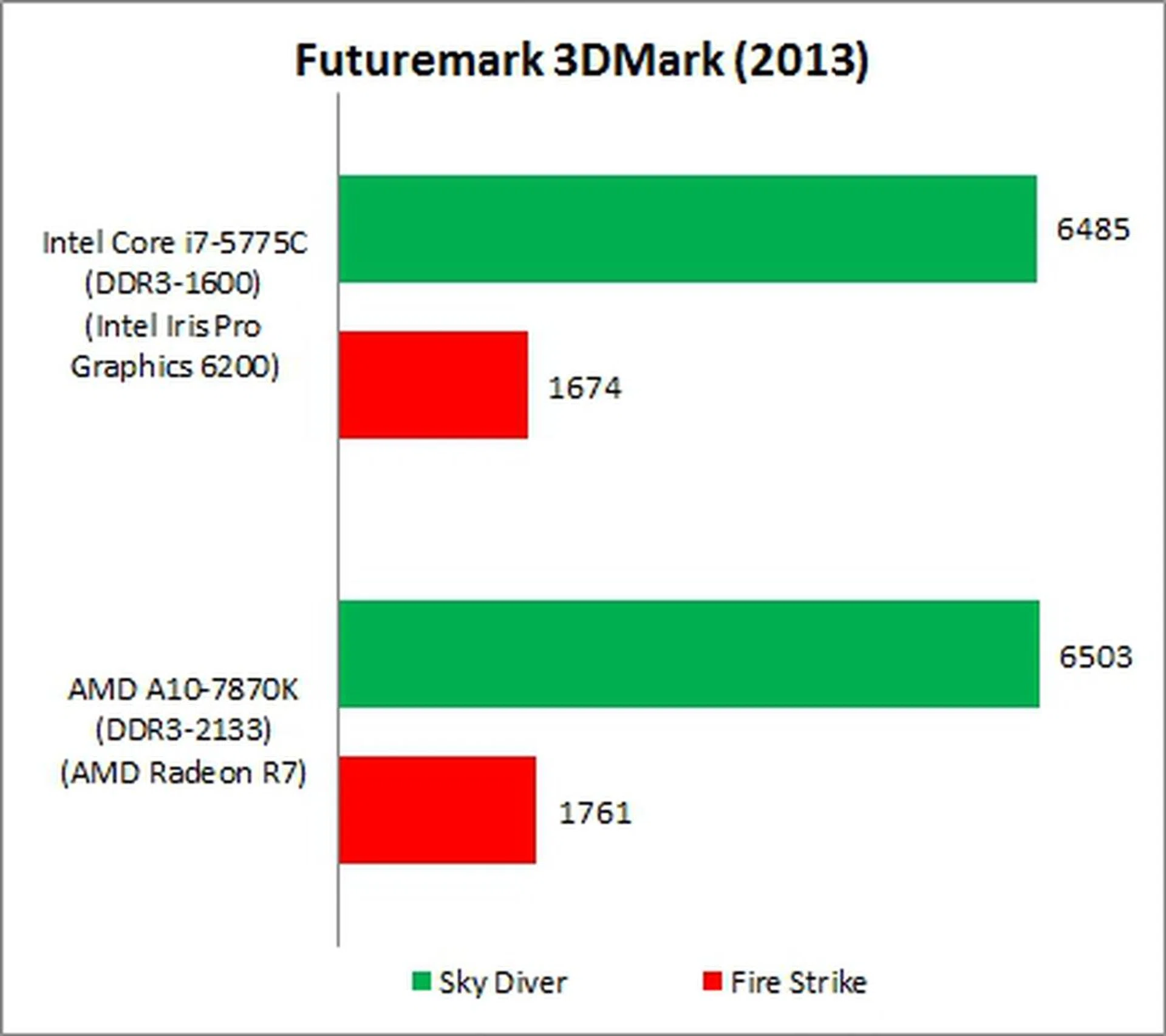 For the Sky Diver test, the A10-7870K pulled ahead by less than 1%; however, for the more demanding Fire Strike test, the higher video memory and its higher clock speed of the system RAM, the AMD APU managed a 5.2% winning margin against the Intel CPU.
