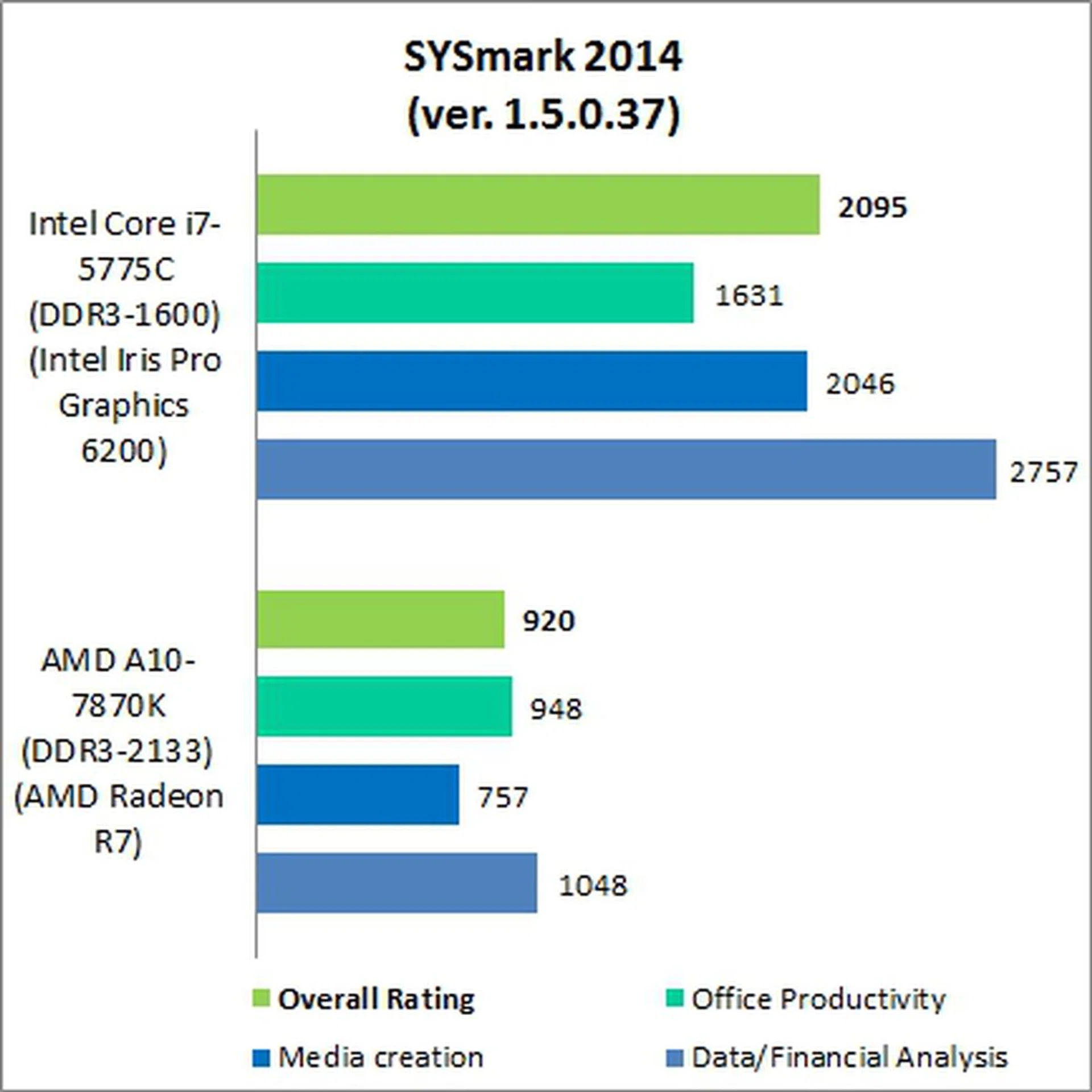 Given the neck-to-neck graphics performance of both processors, we decided to throw in an additional benchmark, SYSmark 2014, in order to gauge the overall performance of each. As expected, the Intel Core i7-5775C processor pulled ahead by a wide margin of 128% for the test's overall score. The benchmark measures the response times of the PC against a slew of application workloads, so the higher the scores, the faster the response times of the system. By looking at the overall score again, we can safely conclude the Intel system is about twice as fast the AMD machine.