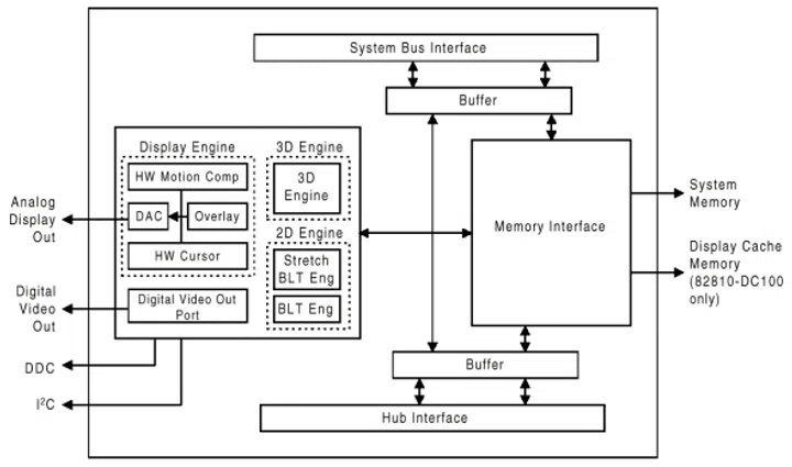 There are 2 versions of the GMCH, the 82810 GMCH and the 82810-DC100 GMCH. The main difference between them is that the DC100 version has the Display Cache Interface integrated which supports 4MB of external display cache. Both versions of the GMCH are pin-compatible, hence one manufacturer can have a low cost model and the premium model without the need to redesign the base model. Here's a schematic of the GMCH:-