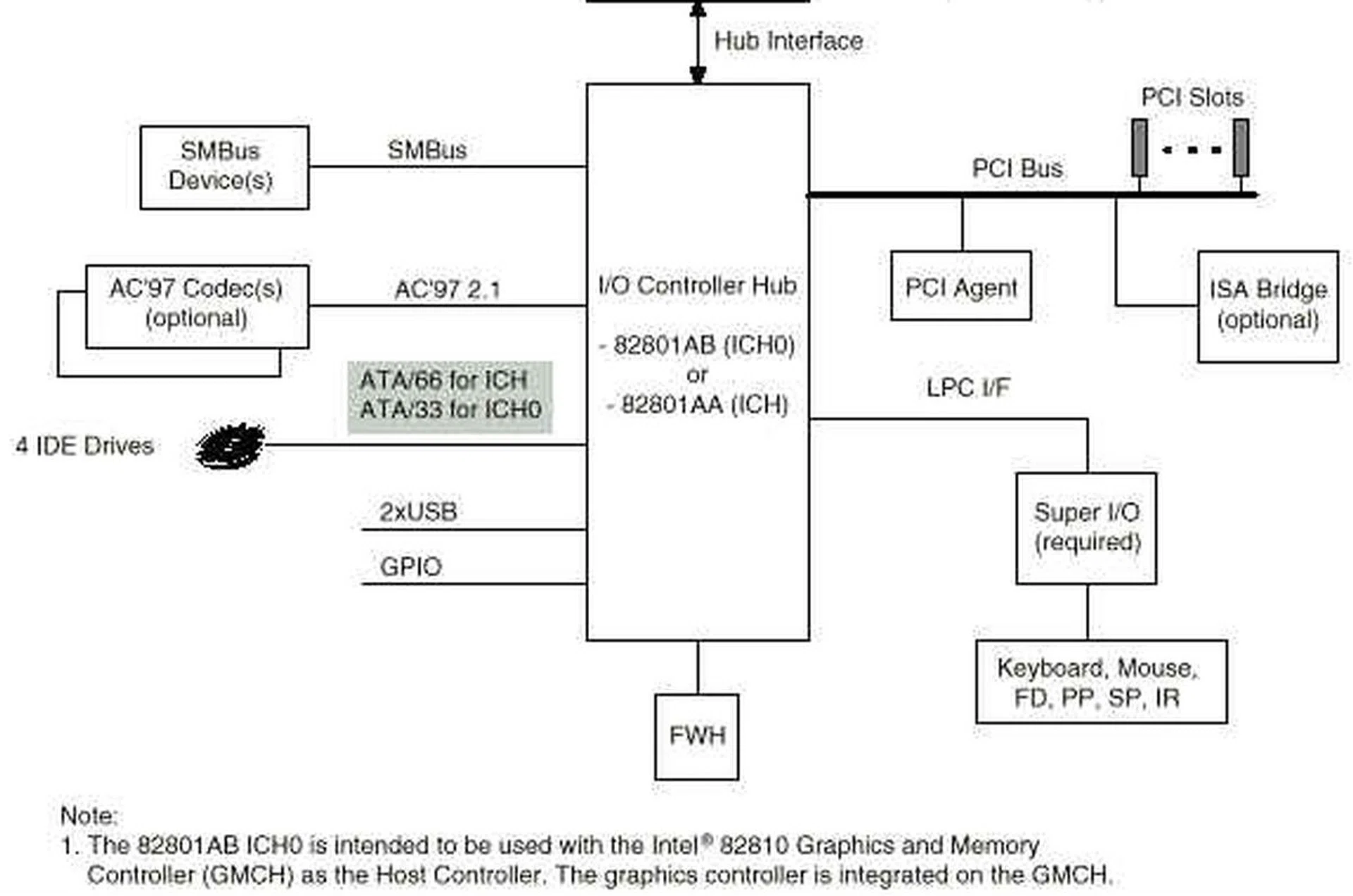 The Input/Output Controller Hub (ICH) is is a highly integrated multi-functional I/O Controller Hub that employs the Intel Accelerated Hub Architecture (AHA) to make a direct connection from the graphics and memory subsystems to serve other chipset-enabled functions like the integrated AC97 controller, IDE controllers, dual USB ports, and PCI add-in cards. The following is the proper break down of the ICH's functional components: