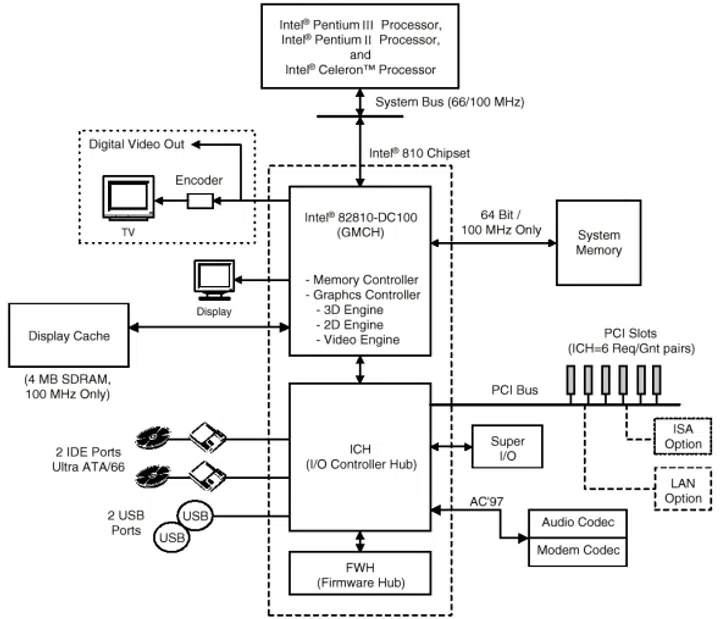 Traditionally everything on the system communicates with the CPU and memory via the slow and perhaps saturated central PCI bus, but with the introduction of the i810 chipset, a new architecture is born and is called the Accelerated Bus Architecture (AHA). AHA allows direct communication of the CPU, memory, graphics (built-in to the chipset) and other peripherals. It replaces the PCI as the central bus and the typical North and Southbridge chipsets with a three-hub architecture. The three hubs (which are distinct chips) are the Graphics and Memory Controller Hub (GMCH), the I/O Controller Hub (ICH) and the Firmware Hub (FWH). The below diagram will help to explain how the new AHA works and how each hub helps: