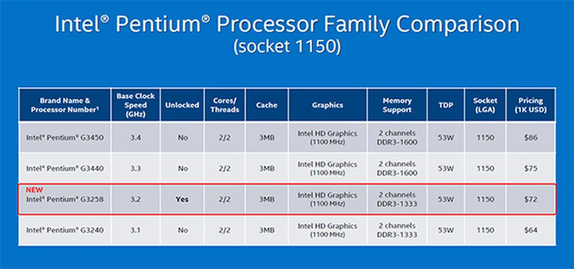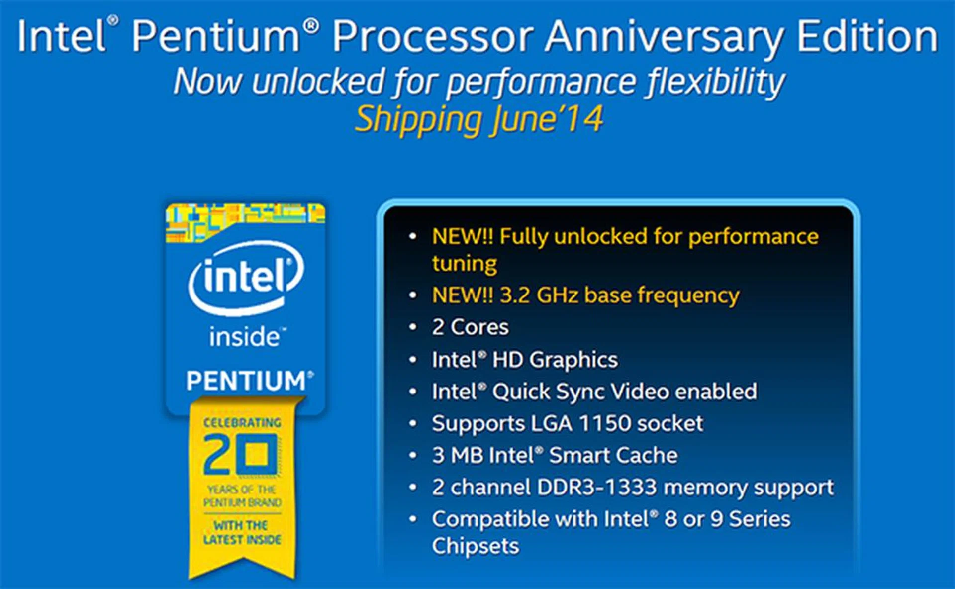 To celebrate 20 years of this Pentium brand, Intel will make available a special anniversary edition of the Pentium processor for enthusiasts. Based on the Haswell architecture and the latest 22nm process technology, the new Pentium Processor Anniversary Edition is a dual-core processor with a base frequency of 3.2GHz. But what sets this apart from the rest of the other Pentium processors is its unlocked core that will allow overclockers to tune its performance. Since it's a dual-core part, overclocking should be easier than its quad-core counterparts and it won't cost a bomb as well. Priced at only US$72 for 1K units, the Pentium Anniversary Edition will be available sometime in June 2014 and will be sold as an Intel Pentium G3258 processor.