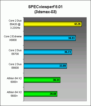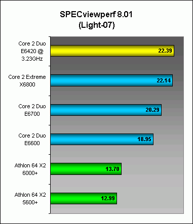 SPECViewperf's OpenGL nature has a mix of workloads that stresses the memory subsystem and scales well with CPU and GPU performance. With the GPU being capped in every test scenario, we've highlighted a couple of viewsets that scale well with regards to CPU performance. A rough glance of the results in the graph below show that the overclocked E6420 processor fares well in the comparison as it reaps 8 to 11% performance gain even against the Core 2 Extreme X6800. When stacked up next to a stock clocked Athlon 64 X2 6000+ (not that it can overclock much anyway), the E6420 at 3.23GHz was found to have a whopping 50% advantage. Imagine how much time a speedy Core 2 Duo can save you when getting such graphics jobs done!
