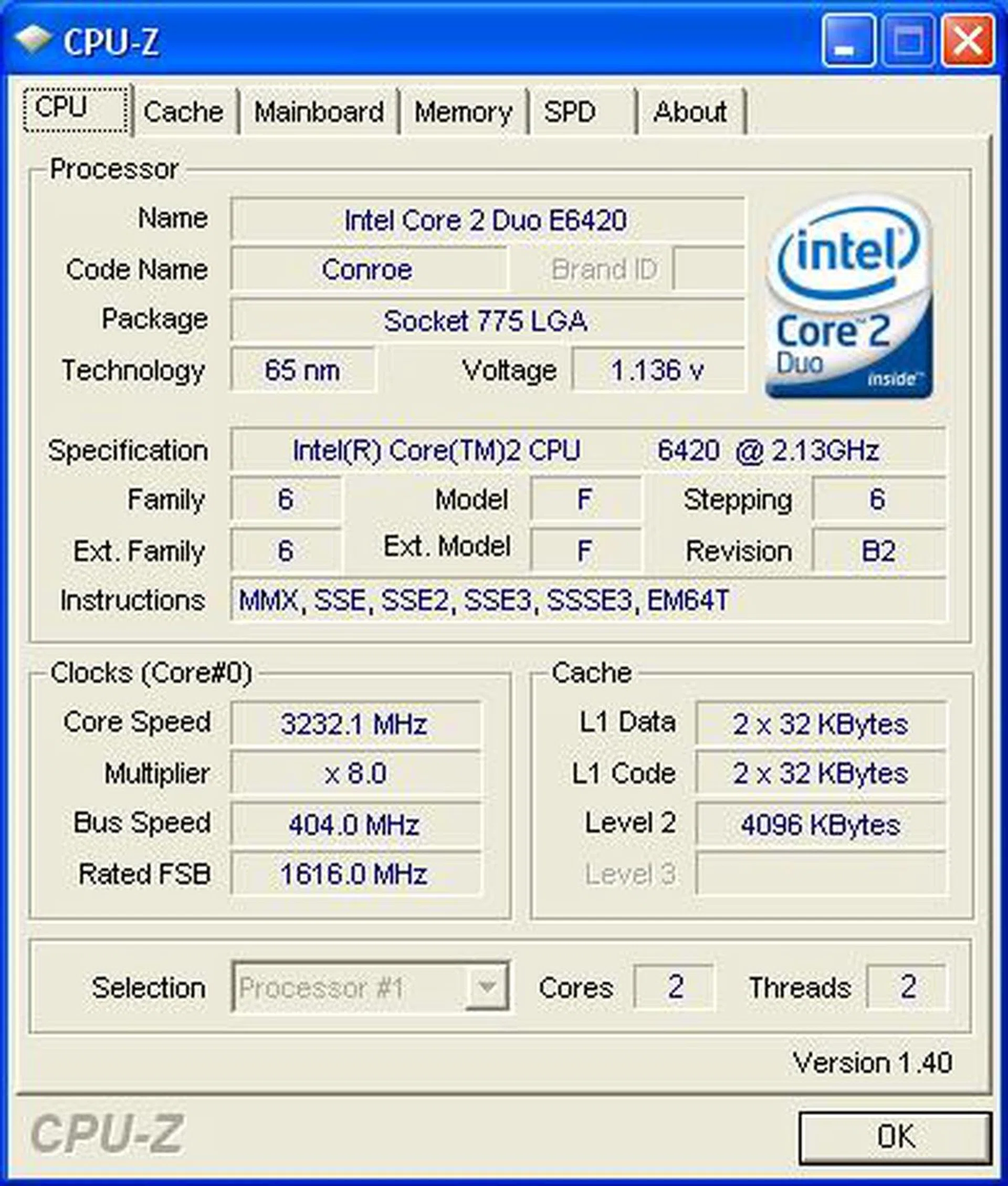 - Intel Core 2 Duo E6420 CPU @ 3.23GHz (404 x 8)