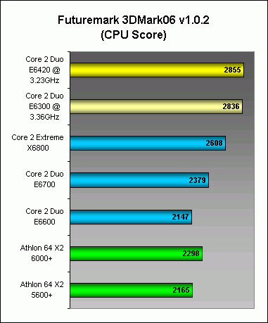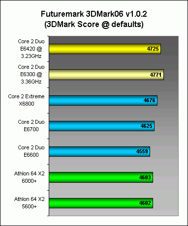 In Futuremark's 3DMark06, the CPU score was in favor of the new Intel E6420 overclocked at 3.23GHz, but the actual overall gaming score tilted in favor of the E6300 that was higher clocked at 3.36GHz. Games have always primarily shown performance gains with increments in CPU clock speeds and this was again repeated in this scenario. The good thing is that the overclocked E6420 still ranked ahead of the Core 2 Extreme X6800, making it a really viable path.