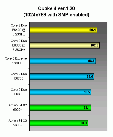 While Quake 4 does benefit from a speedier CPU, with SMP enabled to utilize modern dual-core processors, the gains from pure CPU overclocking are limited. Changes to the GPU subsystem definitely generate much larger gains than the gradual differences noted here. Strictly comparing the two overclocked processors, the 3.36GHz E6300 once again outpaced the 3.23GHz E6420 processor by a small margin.
