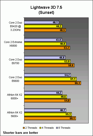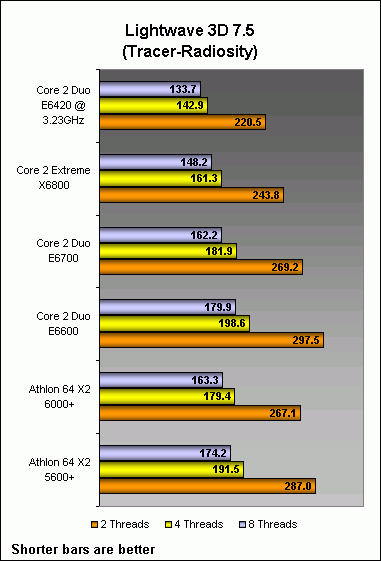 AMD processors fared much more competitively in this 3D modeling program's render tests, but Intel Core 2 processors still bagged the victory here again. The overclocked Intel Core 2 Duo E6420 processor too fared well, especially in the more complex Tracer-Radiosity render set.