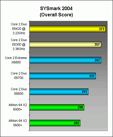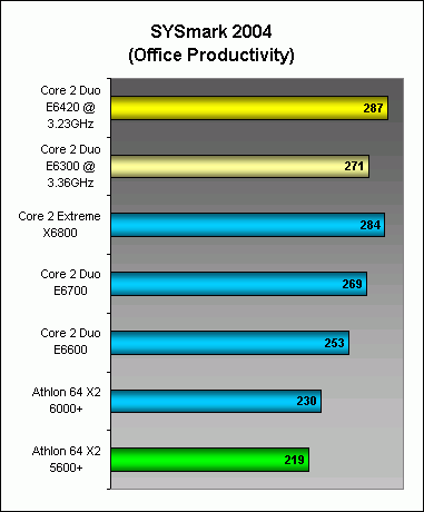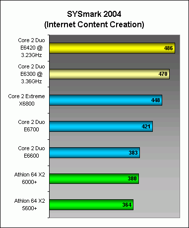 The overclocked E6420 at 3.23GHz is clearly the fastest processor in our first round of application based testing via Bapco's SYSmark 2004. Be it office productivity or multimedia content creation applications, the E6420 reigns over the faster clocked E6300. This clearly illustrates the power of the bigger L2 cache in heavy and varied system workloads. Overall this US$180 processor is 4 to 7% speedier than the most expensive Core 2 processors. When pitted against the AMD's top performer, the E6420 at 3.23GHz was found to have a startling leap up to 30%.