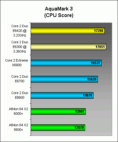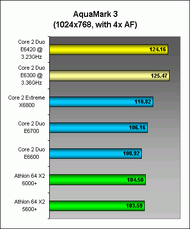 Different game engines react to subsystem improvements in different ways. Unlike 3DMark06, AquaMark3 benefits from every boost in subsystem performance. As such, it scaled very well in both the overall rendering performance as well as the CPU performance score, which takes into consideration many platform parameters. This is why both the overclocked processors fare exceptionally well in this test with both performing very much on par.