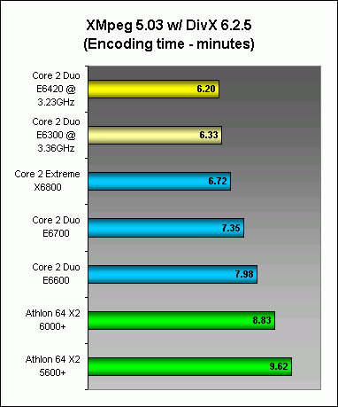 However, as our XMpeg encoding test shows, clock speed advantage isn't everything. The results indicate that the Core 2 Duo E6420 at 3.23GHz managed a small lead against the overlocked E6300 at 3.36GHz and shows off its L2 cache prominence in this test.