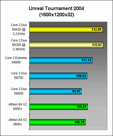 The E6420 at 3.23GHz in Unreal Tournament 2004 showed similar sizeable gains of up to 30% over competing stock-clocked processors just like in AquaMark3. And that's even when the test was configured to simulate an intense multiplayer environment with a multitude of bots to elevate CPU loading levels.