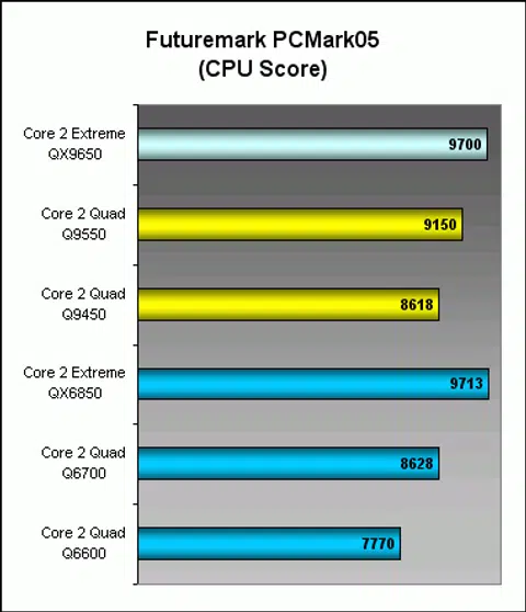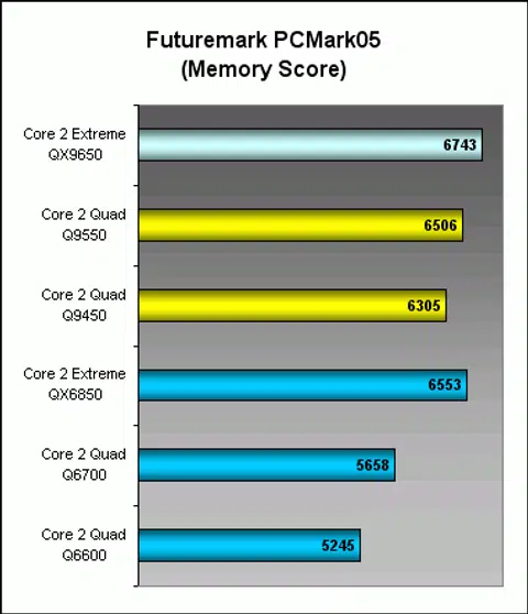 PCMark05's subsystem testing once again identified similar findings where the new Penryn-based quad-core processors performed better than their 'equivalent spec'd' predecessors. The better memory performance can be attributed to the larger cache as well as the improved caching and memory management techniques found on the 45nm processors.