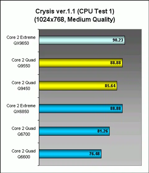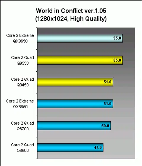 Last but not least, we take a look at the CPU's influence in a couple of the newest games of today - World in Conflict and Crysis. Do be reminded that the testbed is fitted with a GeForce 8800 GT graphics card to ascertain real-world performance as this is one of the more popular high-end graphics cards that is sought after these days.