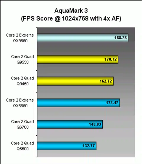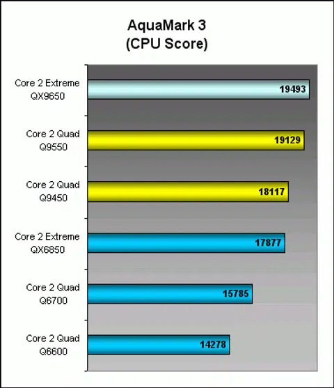 Using the old but reliable AquaMark engine for quick performance testing, we found the Penryn processors excelling against the older Kenstfield processors by a good margin, both in the CPU and graphics test results.