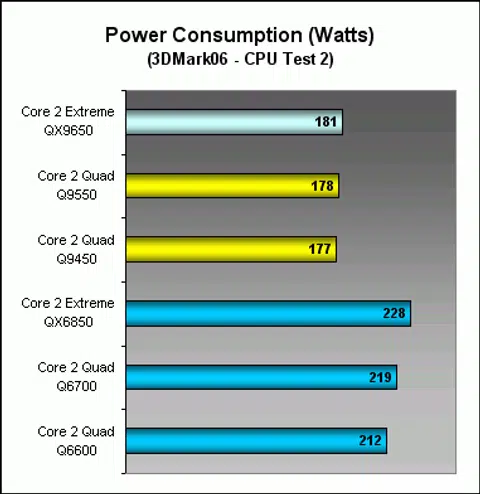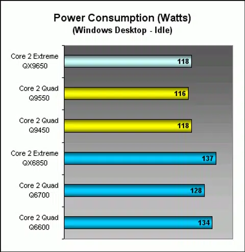 Using a power meter at the power outlet to collectively measure the entire system's power draw, the newcomers at idle save anywhere between 10 to 15% of the usual power draw on systems running a Kentsfield processor. That's a tidy amount of power savings from not doing anything and it's inline with what the QX9650 processor achieved.