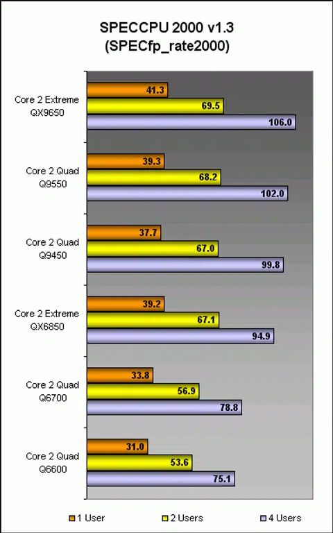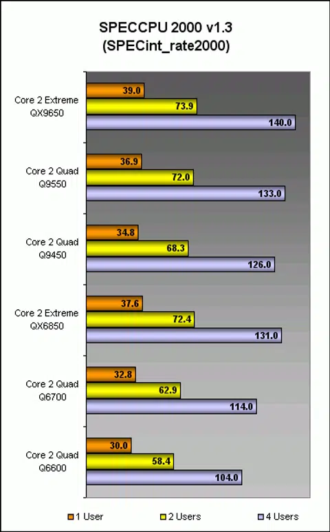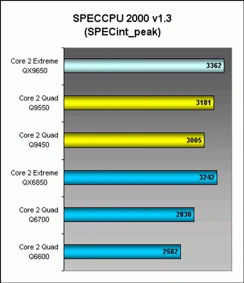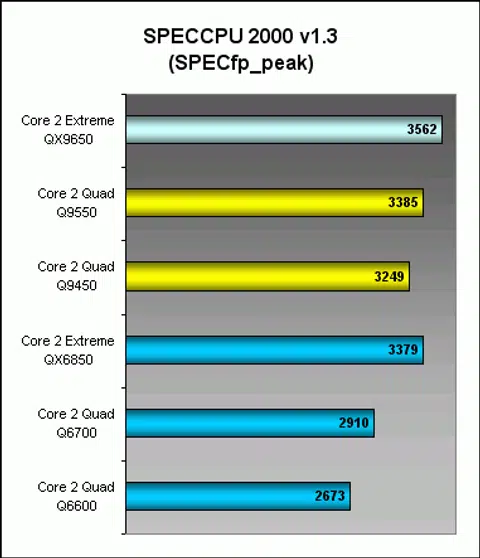The peak scores for integer and floating point performance of both the new quad-core processors in SPEC CPU2000 1.3 are much better than their predecessors clock-for-clock thanks to the increased cache and enhancements to the base Core microarchitecture as seen in our first Penryn processor review of the Core 2 Extreme QX9650. As seen from the graph below, the Core 2 Quad Q9550 easily matches up against the older Core 2 Extreme QX6850 while the Q9450 has much better performance than the similarly clocked Q6700 processor.