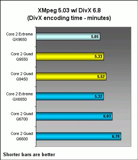 Moving on to video encoding using XMpeg and the latest DivX 6.8, performance here too was up to expectations as the Q9550 matched up against the QX6850, while the Q9450 bettered the old Q6700 in the cost to specifications department that also helped achieved its better performance.