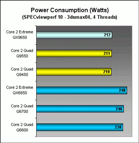 From our various ongoing benchmarks day to day, we've identified that the quad-threaded 3dsmax viewset in SPECviewperf 10 to be one of the more taxing scenarios as it maximized all the CPU cores and quite a bit of the GPU as well. It is in fact more taxing than 3DMark06. In such a test scenario, we found that all the Penryn based processors managed an average of 15% power savings over the older Kentsfield 'counterparts'.