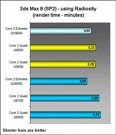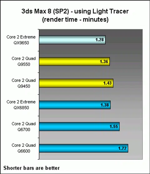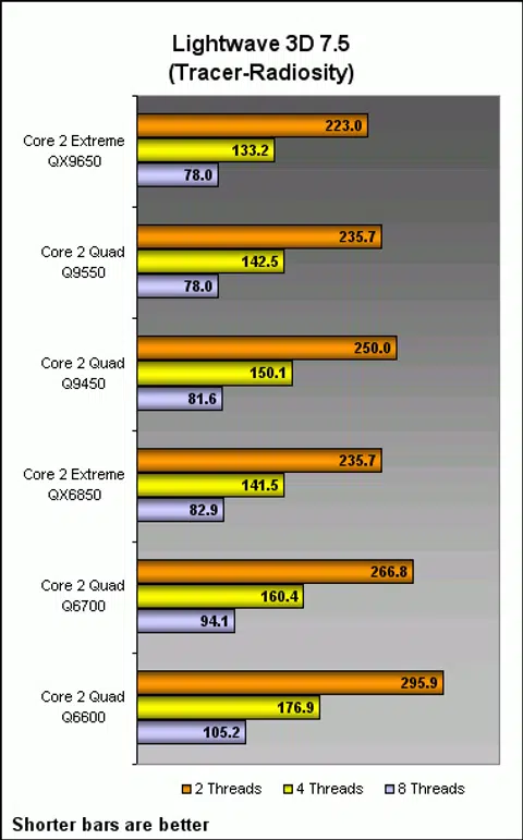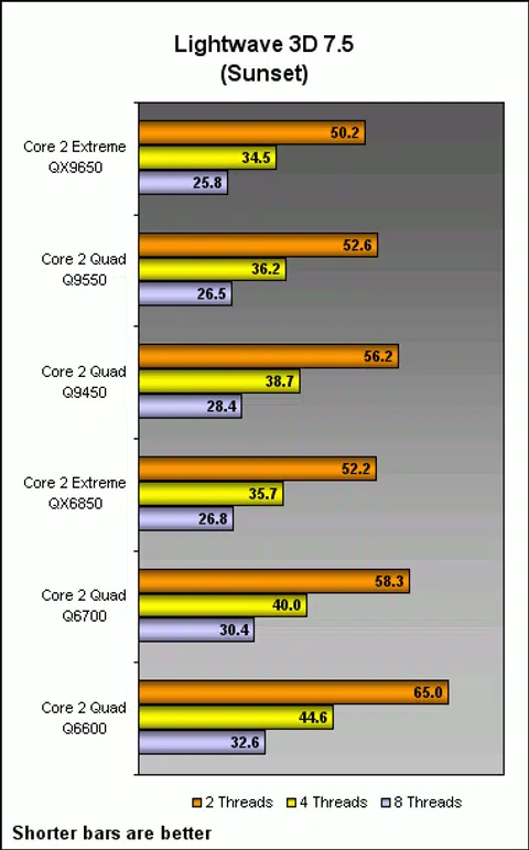 Moving on to rendering tests in Lightwave 3D, we again find consistent performance among the newcomers. In fact, the Q9550 and Q9450 processor actually fared slightly better than their 'competing' predecessors, the QX6850 and Q6700 processors respectively.