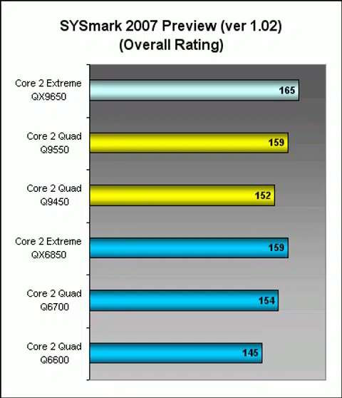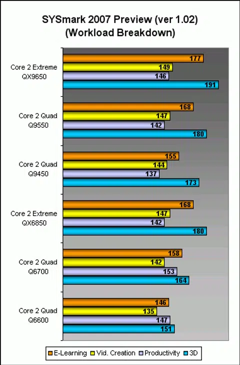 In the newer SYSmark 2007 Preview of Bapco's real-world user simulation benchmarking program, the results again sort of mimicked what we found in SPEC CPU2000 tests. The Core 2 Quad Q9550 was just as fast the Core 2 Extreme QX6850 while the Q9450 was almost on par with the Q6700 processor. Even the detailed scoring breakdown has similar performance curves, so there was nothing out of the obvious.