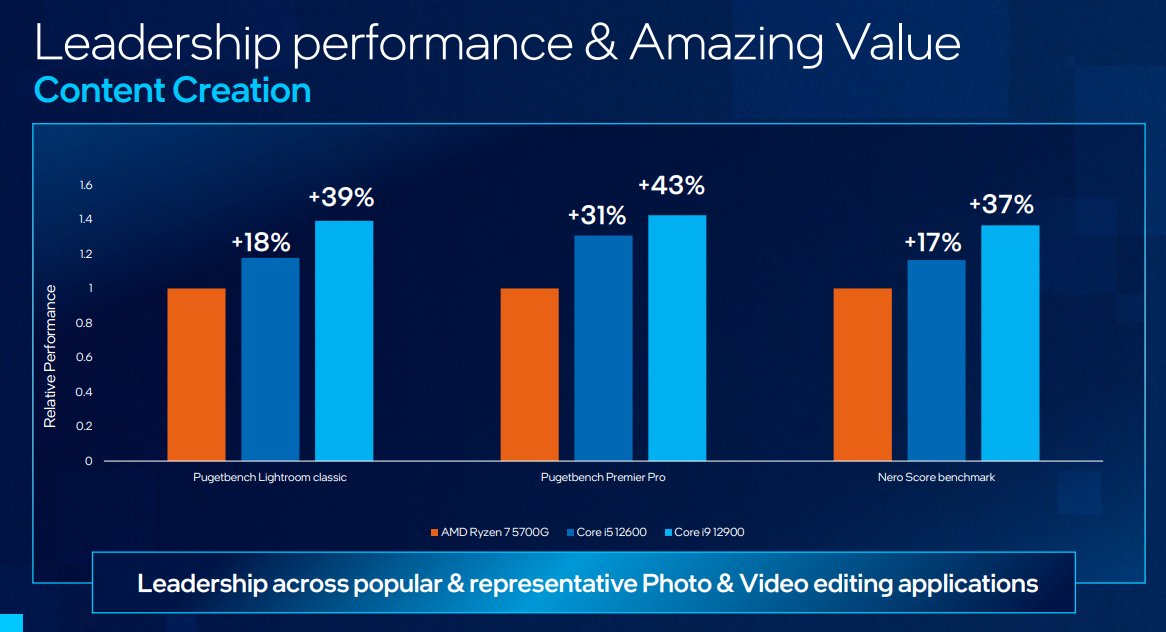 As a consumer, do you have to be concerned? Do the missing E-cores affect performance standings? Looking at the specs list in the table, you'll notice that the base clocks of the P-cores on the Core i5 models are much faster than those on the Core i7 and i9 models. This suggests that while there might be lower performance per watt efficiency, where raw performance is concerned, the Core i5 models can be competitive and perhaps offer interesting performance that we're keen to find out firsthand. According to Intel's testing with industry-specific content creation benchmarks, it does seem like it can hold its own. For example, the new hex-core Core i5-12600 seems to have no problems leading the octa-core AMD Ryzen 7 5700G mainstream processor.
