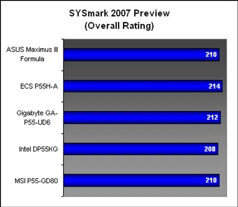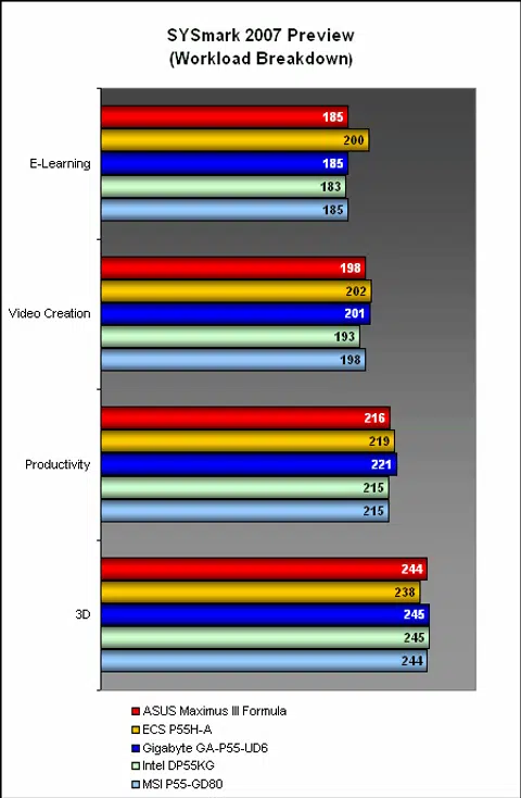 Our first benchmark, system suite SYSmark 2007 sprung a small surprise, with ECS taking on the bigger boys with a impressive start. The P55H-A had a slight lead over Gigabyte, with both ASUS and MSI tying for third. Coming in a close last was the Intel DP55KG. Looking at the breakdown, it became clear that the ECS garnered the most advantage in the E-Learning and Video Creation sections, while remaining competitive in the others. Certainly interesting given that it had to settle for slower memory timings in our test setup.
