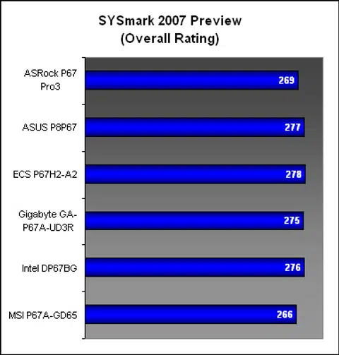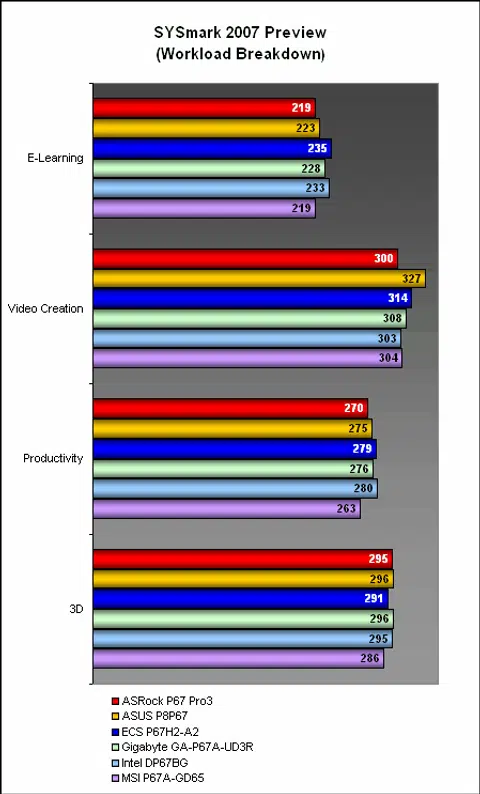 While most of the boards were clustered around a certain SYSmark 2007 score with almost identical results, there were two outliers in the form of the ASRock and the MSI board. Perhaps the slower memory timings on the MSI were holding it back, as there was a distinct 4% difference between the top performer here, the ECS and the MSI.