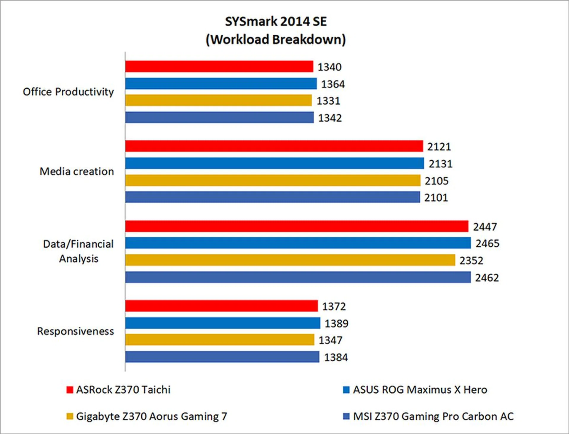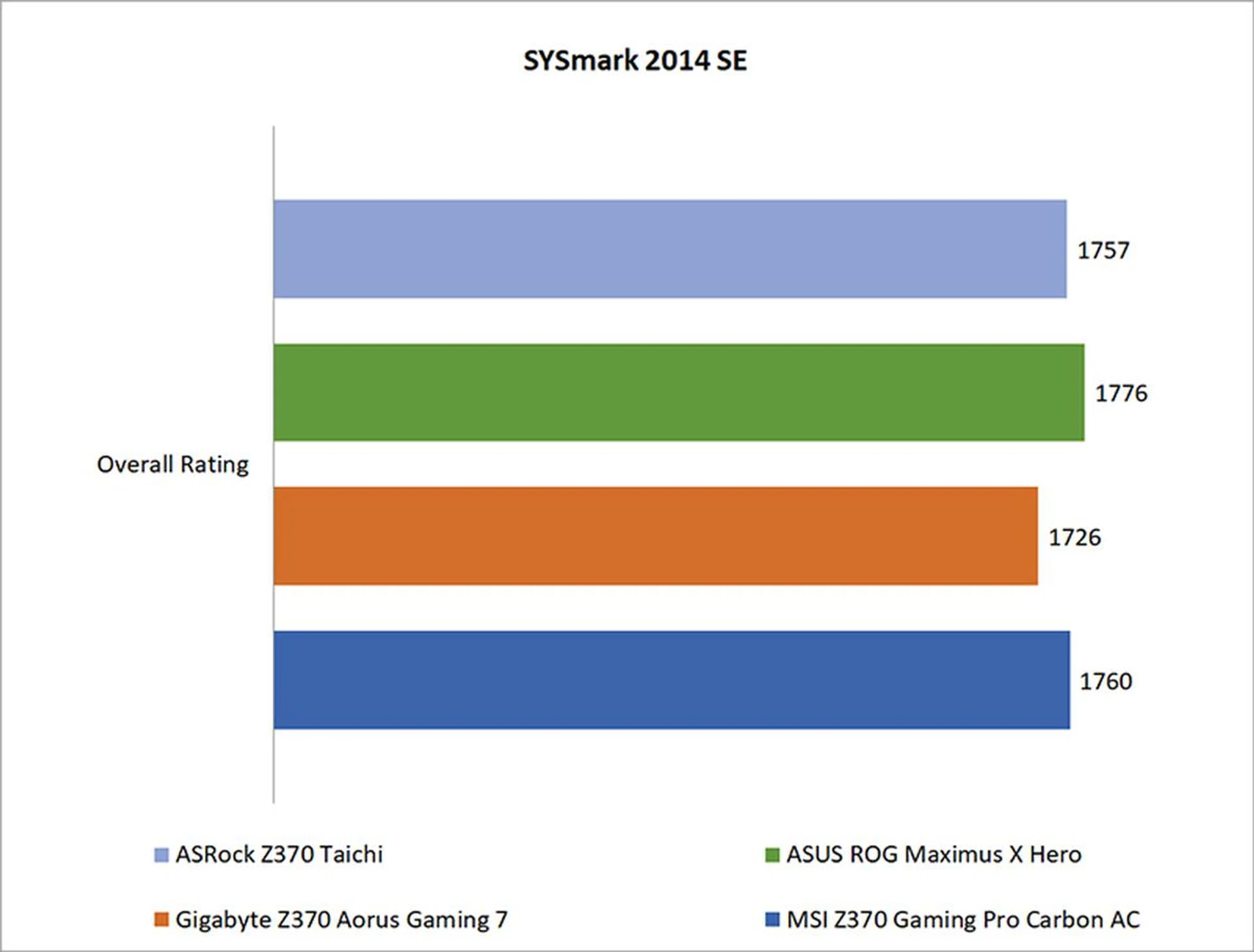 Unsurprisingly, there’s little to distinguish the boards in SYSmark, and they performed very similarly given the otherwise identical configurations. But even though the Gigabyte board looks like it is the bottom performer in terms of overall scores, the difference between the ASUS ROG Maximus X Hero and the former is just under 3 per cent - which is within a reasonable tolerance of deviation.