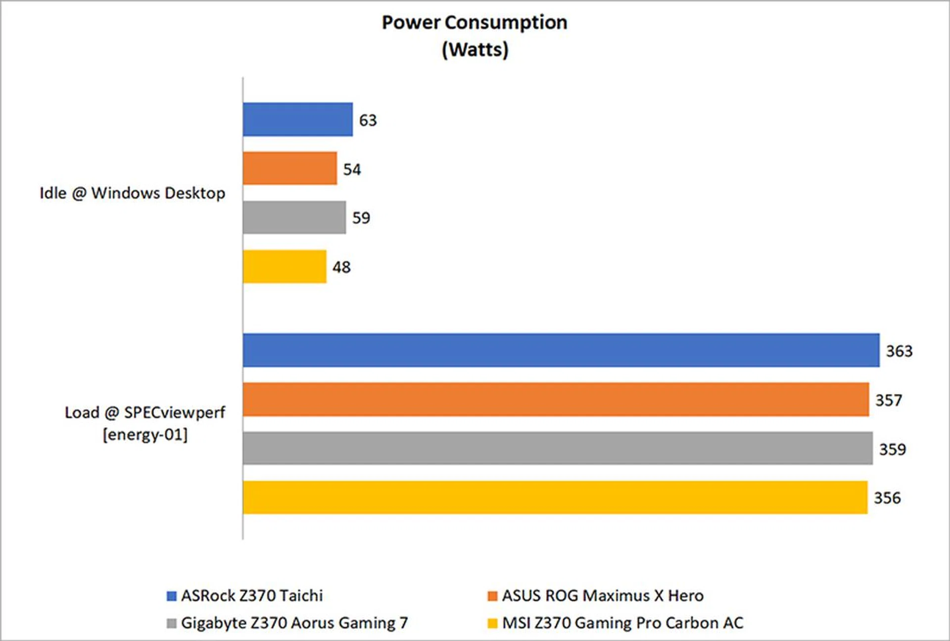 Still, even though it consumed marginally more power than the latter two, it did better than the ASRock board. The ASRock Z370 Taichi has 12 phases dedicated to both the CPU and iGPU, so it should in theory have better power efficiency and better power regulation. As a result, it’s to the Gigabyte board’s credit that that wasn’t the case.