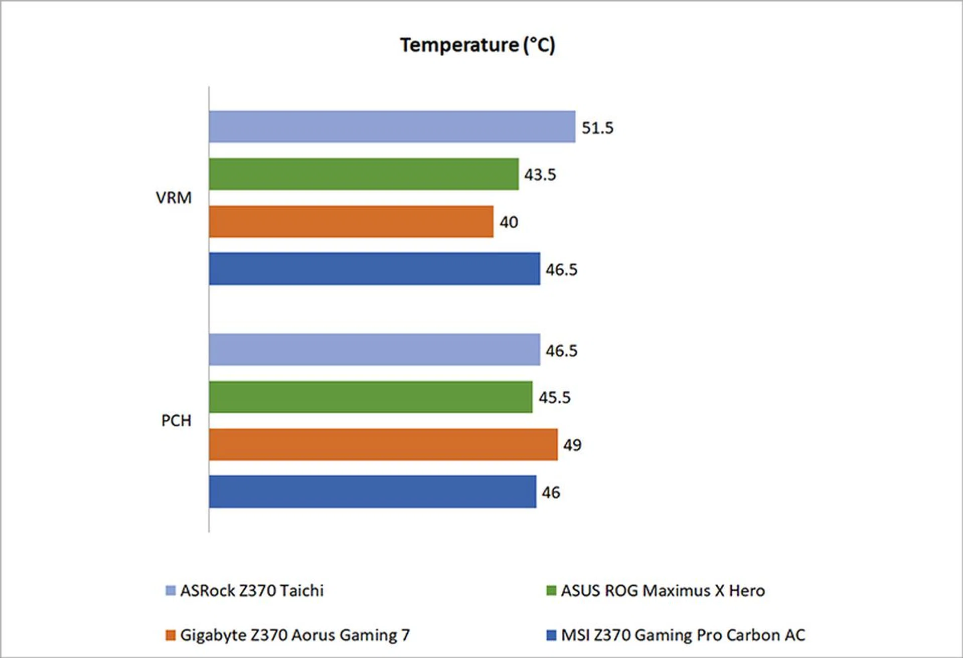 That said, the Gigabyte board recorded the lowest VRM temperatures, but the highest PCH numbers. The board does come with a fan under its I/O shield for the express purpose of lowering VRM temperatures, so this is probably an example of it paying off in practice.