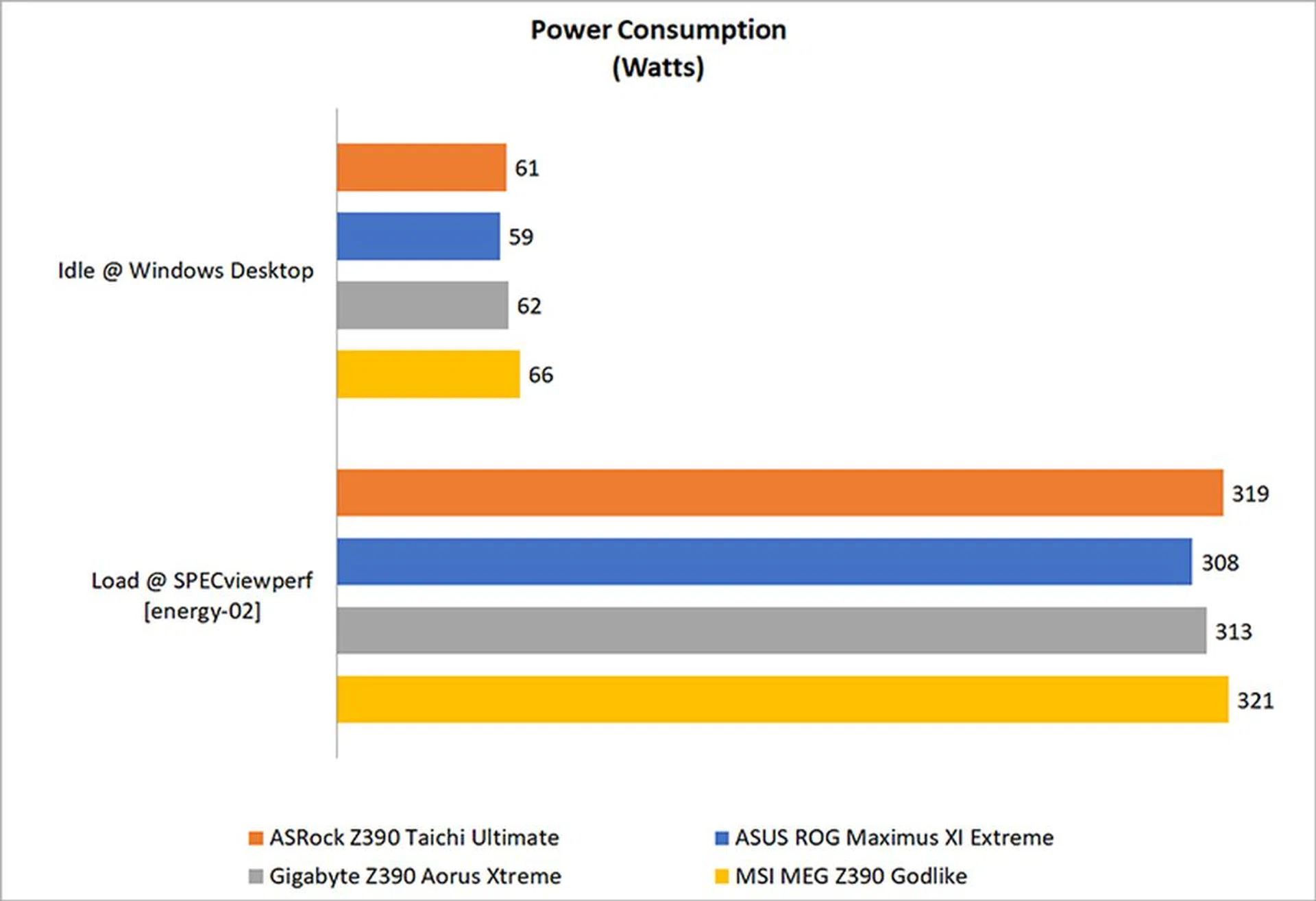 Power consumption numbers are pretty similar as well, but what's surprising is the relatively higher peak power consumption on the ASRock Z390 Taichi Ultimate, considering that it technically had the fewest features of the lot.