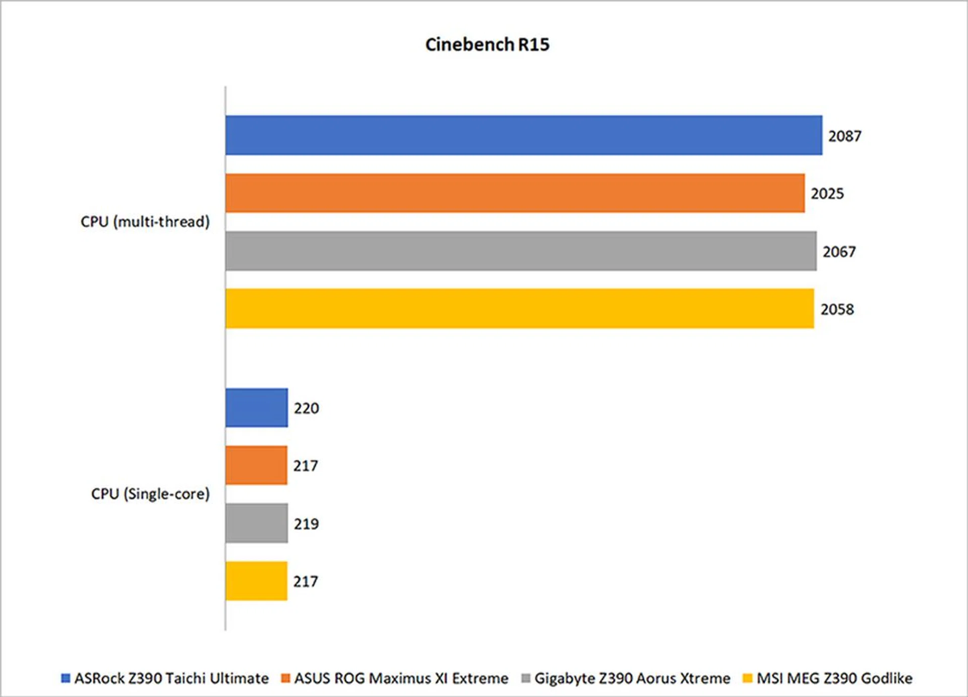 Cinebench is a benchmark tool used to compare CPU performance across different systems, so we’ll be using it to evaluate how well the Core i9-9900K plays with the different motherboards. The multi-threaded test scenario uses all of the system’s processing power – it can utilize up to 256 threads – to render a photorealistic 3D scene, making use of various algorithms to stress all available processor cores. Conversely, the single-core test stresses just one core.