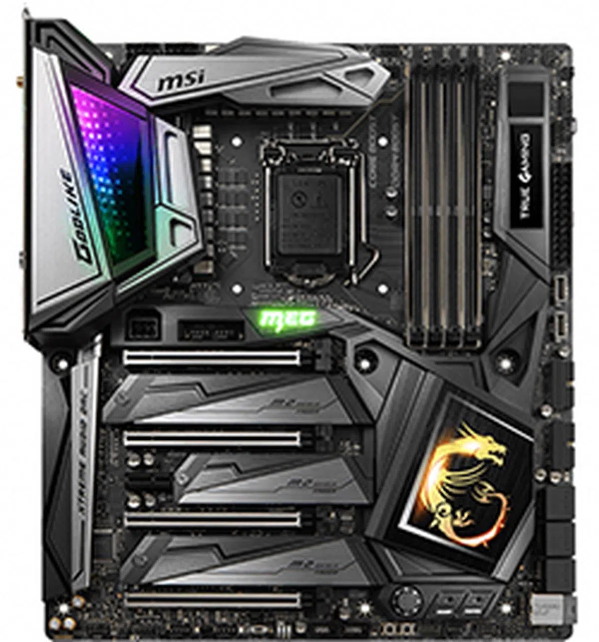 The I/O shroud features what MSI calls Mystic Light Infinity, which takes the form of an incandescent light show that creates the feel of an infinity mirror when you peer into its depths. In the flesh, it’s stunning, and it’s one of the more unique RGB lighting effects I’ve seen on a motherboard today. The right of the board also houses the Dynamic Dashboard, which comprises an OLED display, much like the one on the ASUS ROG Maximus XI Extreme, and a debug LED display.