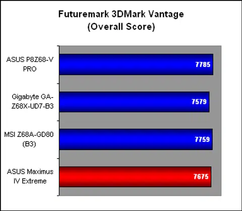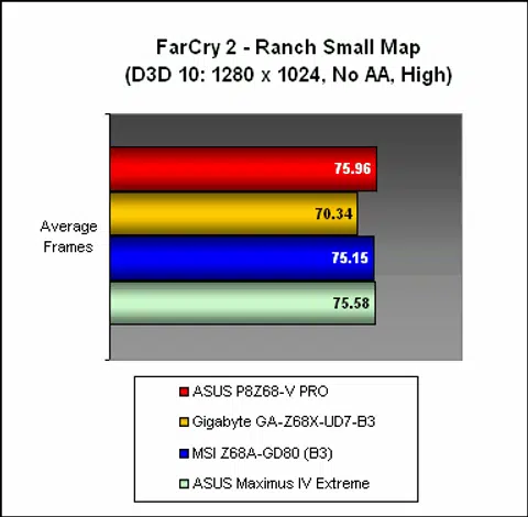 When it came to synthetic graphical benchmarks like 3DMark Vantage, the ASUS and MSI Z68 boards fared identically, with the P67 Maximus following closely. The Gigabyte Z68 however was slightly off the pace. This continued to be the case in the game benchmark, Far Cry 2, where there was quite a significant difference in frame rates between the Gigabyte and the other boards.