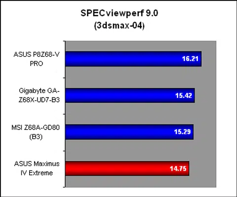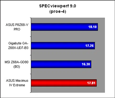 The ASUS P8Z68-V PRO continued its fine run in SPECviewperf 9.0, where it was slightly ahead of the other boards. Again, the Z68 chipset did not exhibit any clear performance advantage over its P67 predecessor.