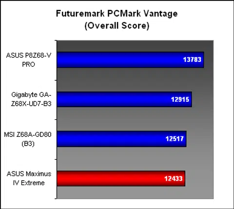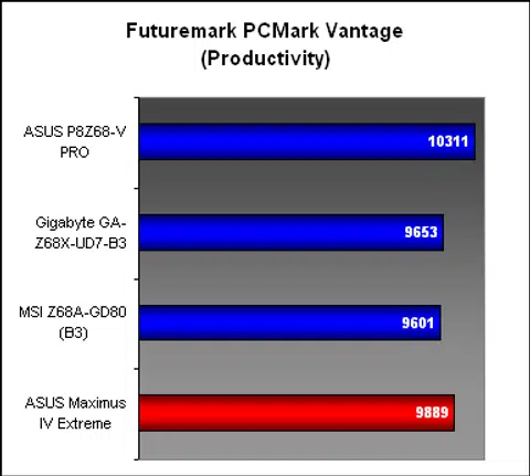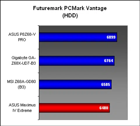 The next system suite, PCMark Vantage found the ASUS P8Z68-V PRO again leading the pack, this time by quite a decent margin across all the sub-categories. The other two Z68 boards were marginally ahead of the P67 Maximus, though in truth, one would be hard pressed to differentiate them.