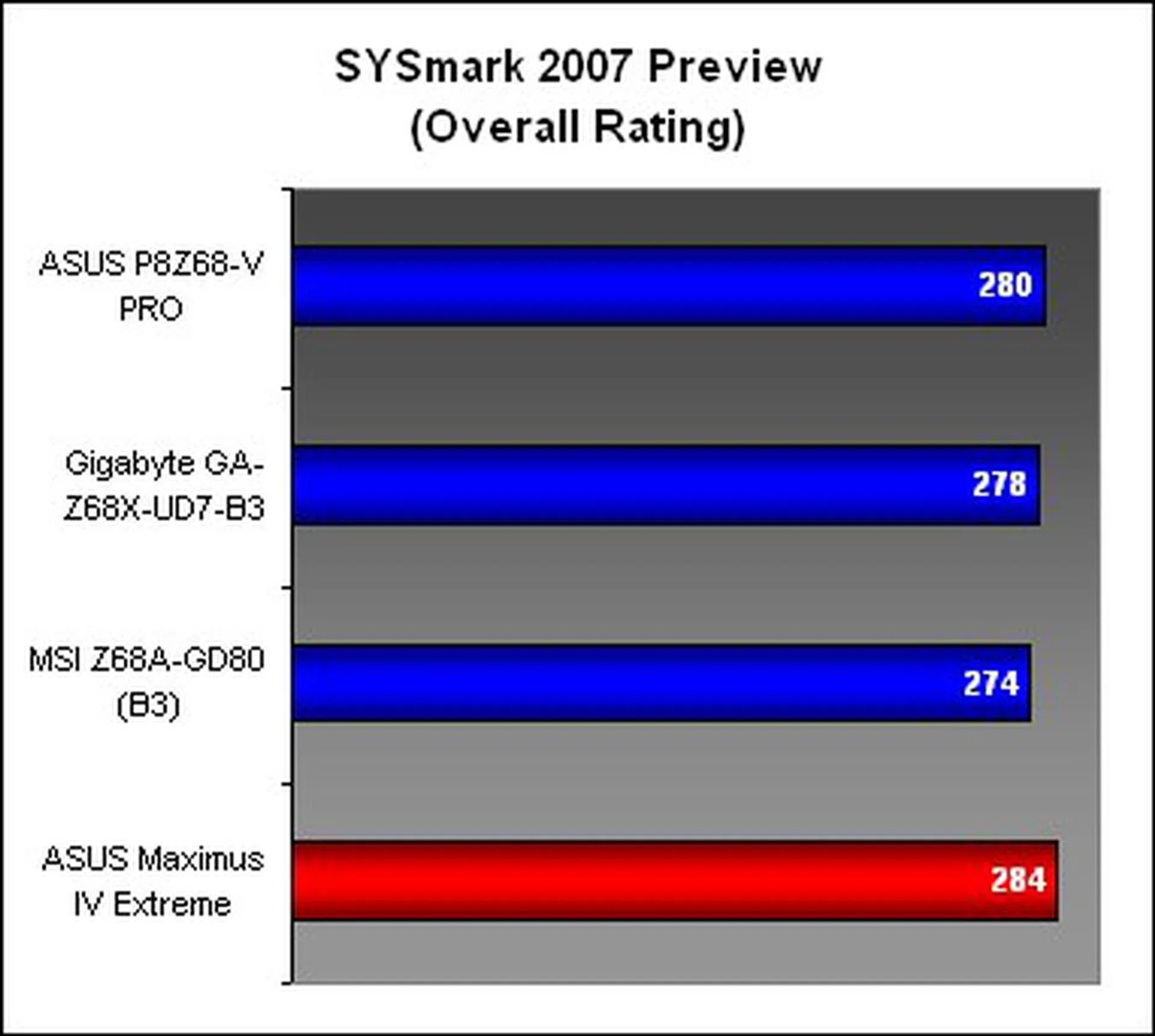 As you can tell from the first benchmark in our test, the system suite SYSmark 2007, the Z68 does not necessarily bring any significant performance boost over the P67 (as represented by the ASUS Maximus IV Extreme). Overall, the scores for the two chipsets are mostly similar, not to mention that the Z68 did have a newer set of drivers. The ASUS P8Z68-V PRO was the best performer for the Z68 contingent, but it was however a tad behind the Maximus IV Extreme.