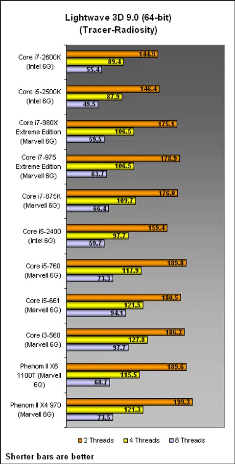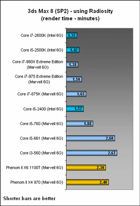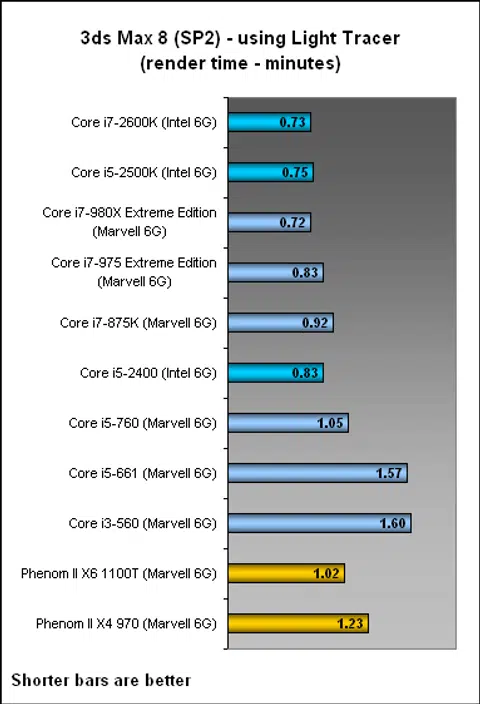 It's becoming clear that not all rendering applications are created equally. 3ds Max 8 saw the Sandy Bridge processors return to the top, with the 2600K just losing to the 980X in the Light Tracer scenarion, but winning narrowly in the latter scenario. For what you're paying, Sandy Bridge is looking like an excellent alternative to Intel's 6-core offering.