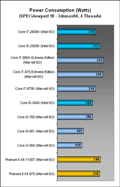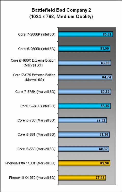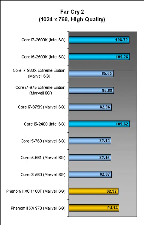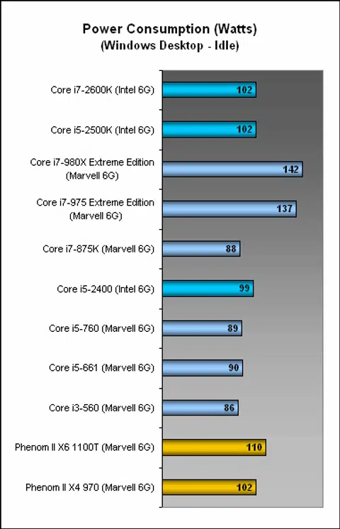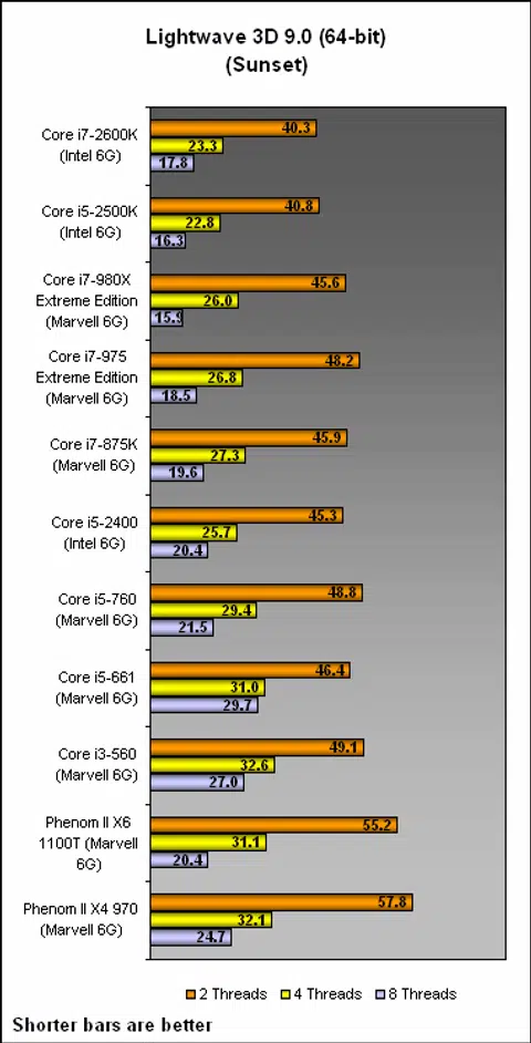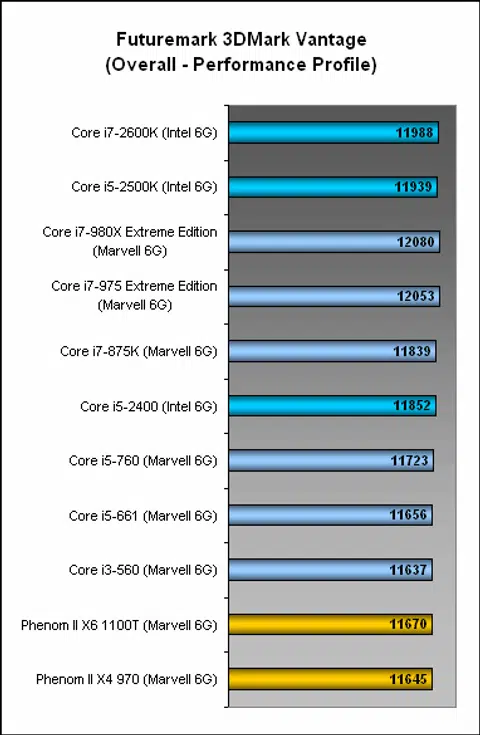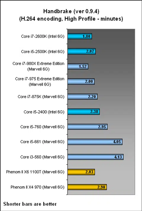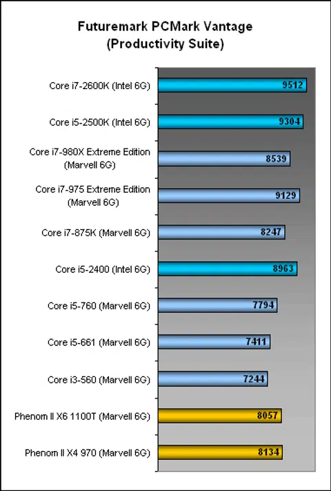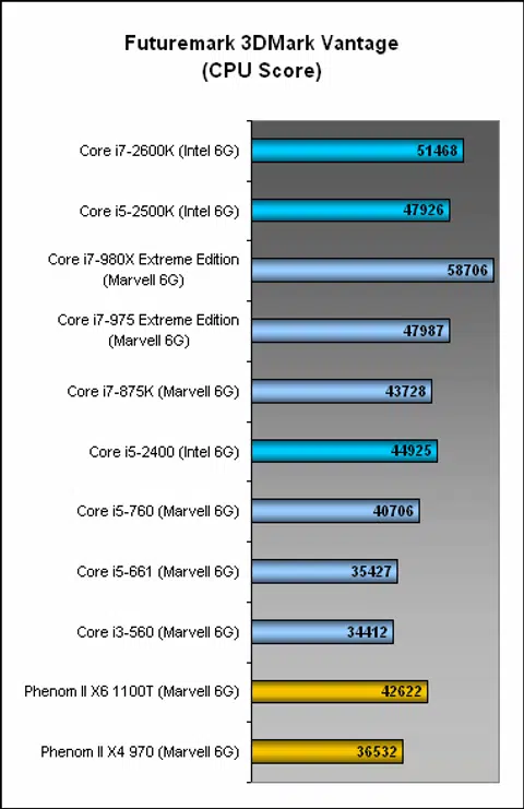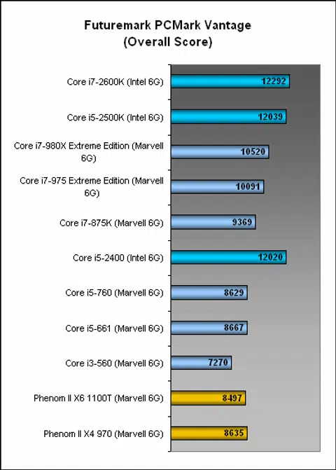 Since the SATA 6Gbps WD Caviar Black 1TB hard drive that we used for all our recent CPU testing has been done with a Marvell 9128 controller, it's possible that when you're comparing the scores of the previous gen Intel Core processors with the new Sandy Bridge ones, like the Core i7-875K for example, the differences between them could be exacerbated by the SATA controller performance. Hence, for all our CPU benchmarks in this review, we have labeled the SATA controller used.